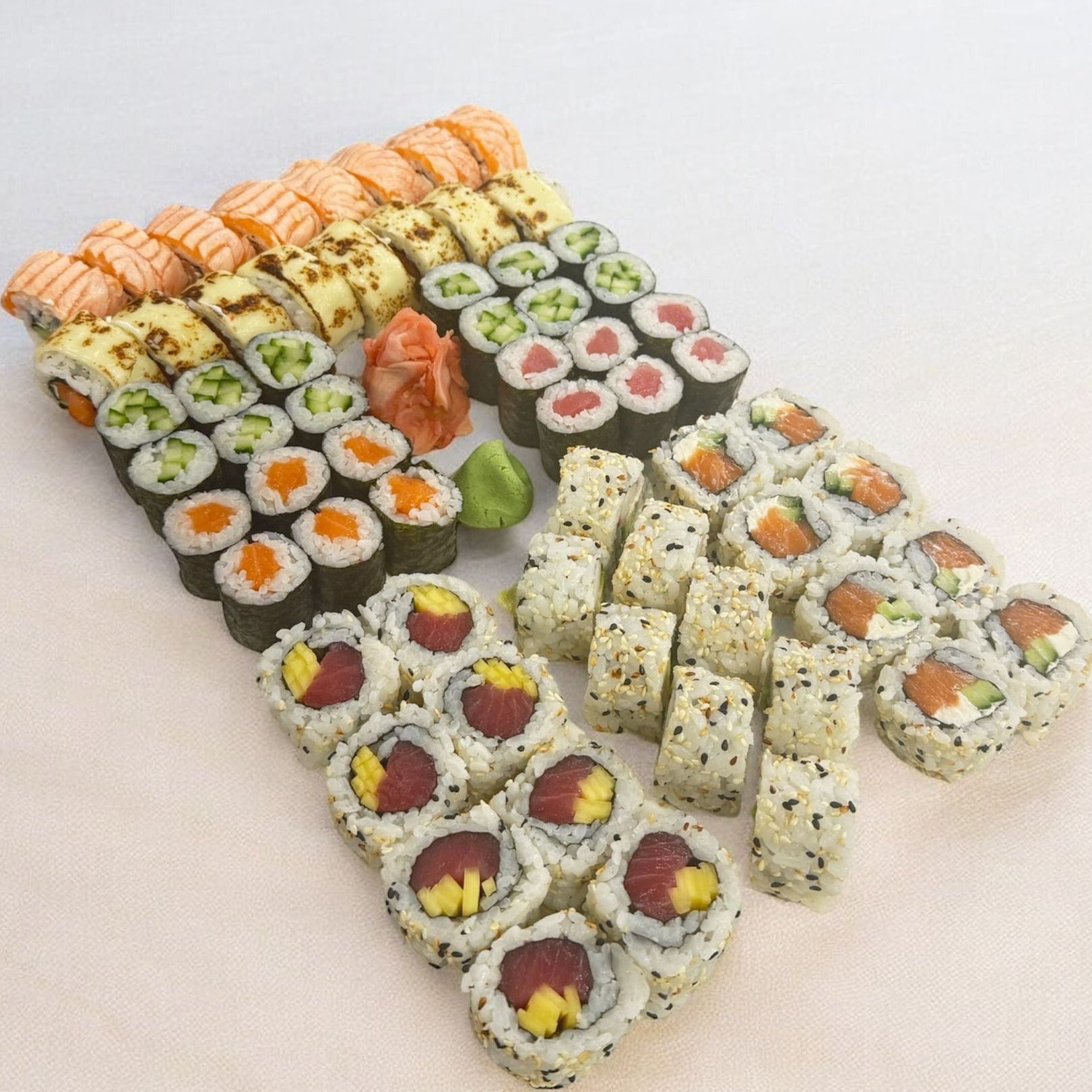 Maki California (8 buc): Conține de surimi, avocado și castravete, fiind învelit în susan. Este fresh și echilibrat.